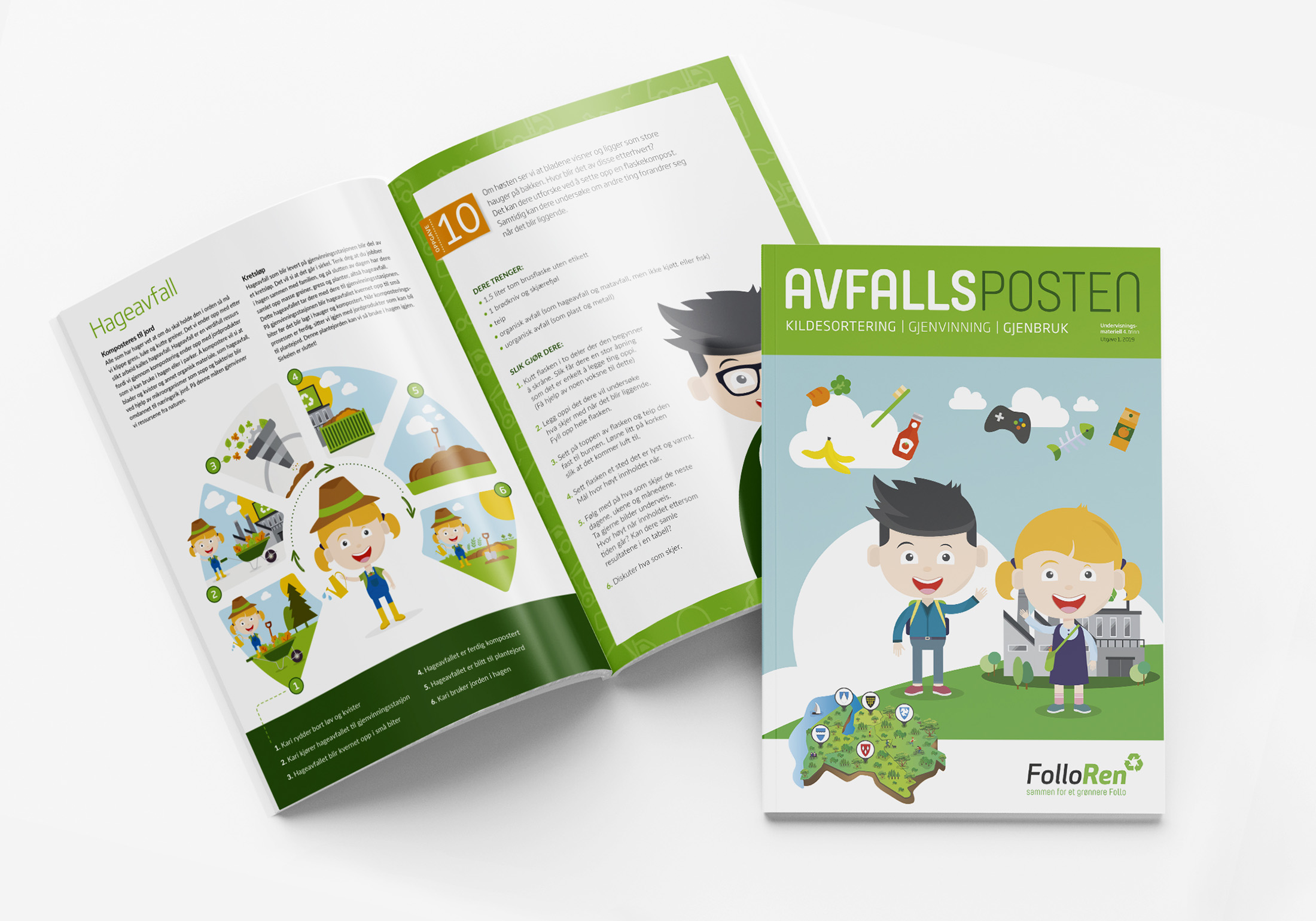 Avfallsposten er et undervisningshefte til bruk i grunnskolen for undervisning på 4. klassetrinn. Aksell har stått for design, alt av grafisk produksjon som illustrasjoner og infografikk, samt utviklet ulike personas, figurer som går igjen i magasinet. Vi har også stått for produksjon og trykk av heftet. I tillegg har vi levert produkter som gymbag, linjaler og blyanter, merket med logo.