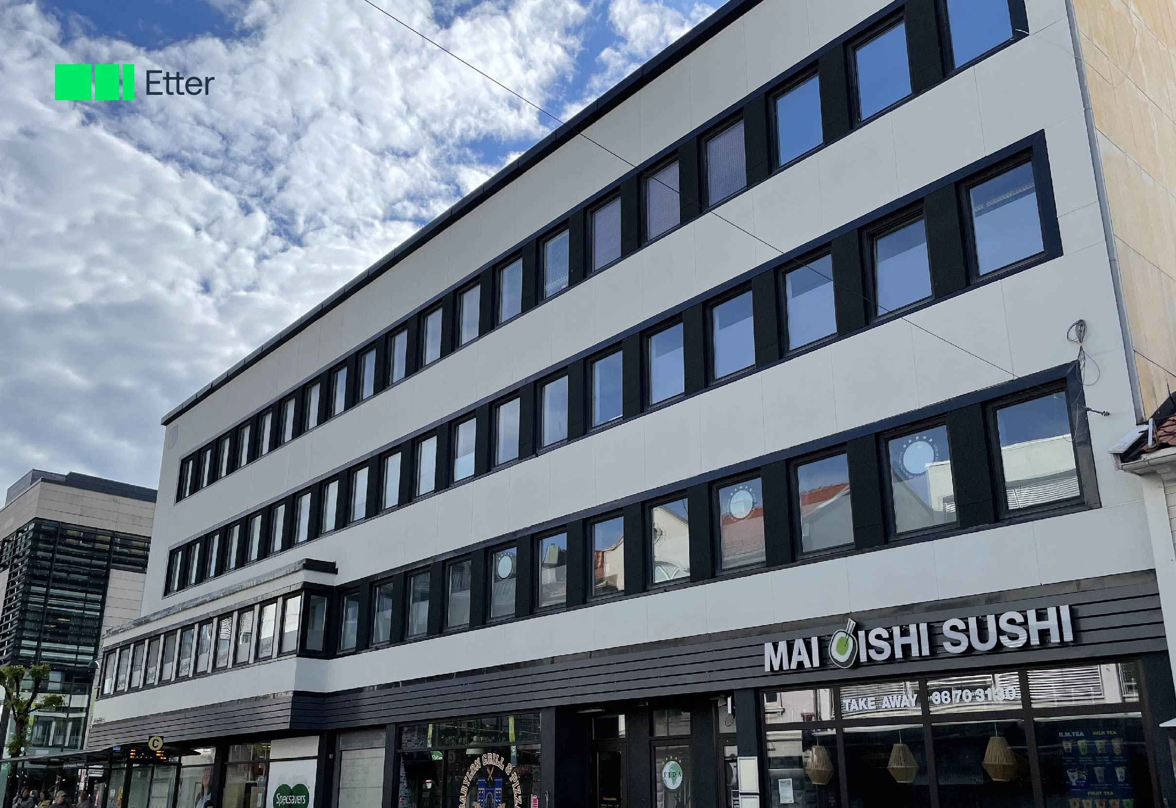 Resultatet ble en fasadeprofil som fremstår moderne og attraktiv i bybildet. Hele bygget inkludert lister, ble malt i en lys farge som står i kontrast til de mørke karmene på dør og vinduer. Vi lagde også en helt ny skinneløsning for skiltene med spiler som går langs hele fasaden.